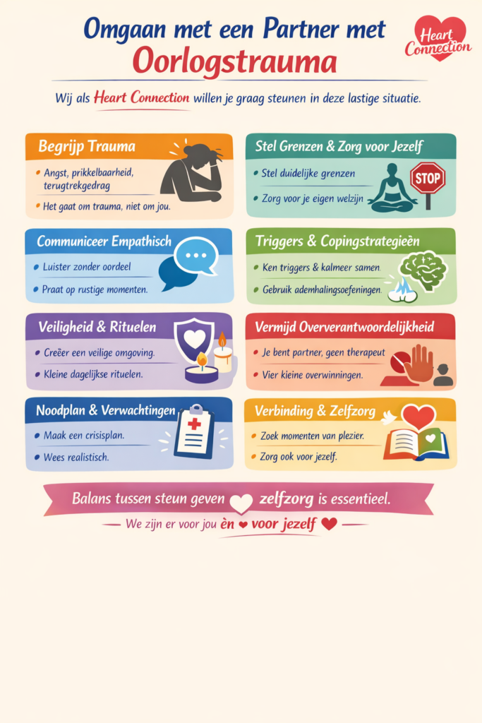 Wij als Heart Connection willen je graag steunen in deze lastige situatie. Omgaan met een partner die oorlogstrauma heeft, kan zwaar zijn, maar er zijn manieren om steun te bieden zonder jezelf te verliezen. Balans tussen steun geven en zelfzorg is essentieel.